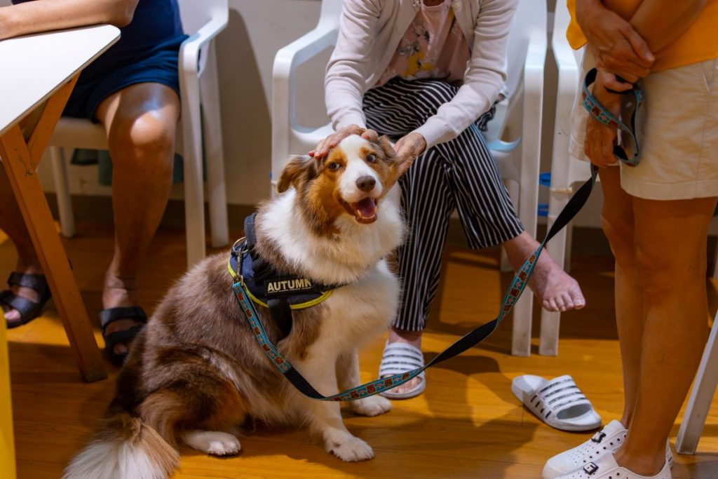 The dogs, brought in by married couple Samuel and Audrey Lee—who worship at Wesley Methodist Church—together with another volunteer, Katherine Goh, are familiar faces here. Autumn has six years of experience in therapy visits while Bella and Bubblee have been serving at Peacehaven for the past two.