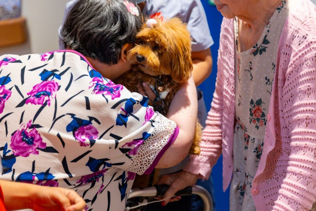 Smaller dogs Bella and Bubblee were placed gently onto residents’ laps to be stroked while Autumn, larger and calmer, lay beside residents to be patted. Laughter filled the corridors as the dogs tumbled through the nursing home like unruly dancers, their exuberance spilling into every corner. At other times, the dogs were doing high‑fives, being fed or taken for a walk in the ward by residents.